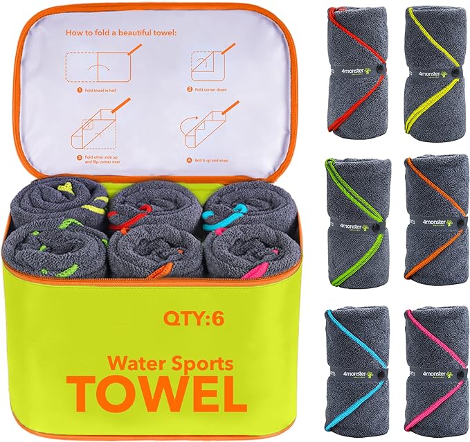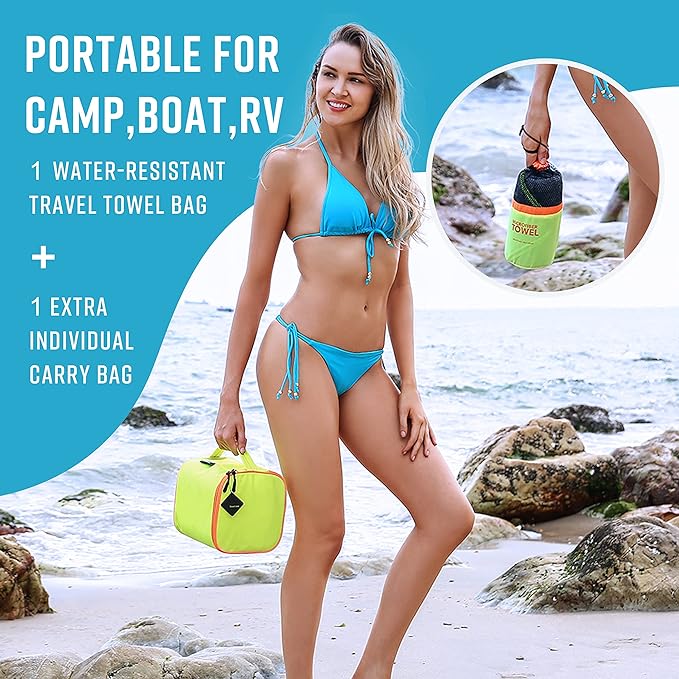 - BRAND NEW DESIGN: Four 24*48"towels in one big case. An extra mesh bag for your own outdoor use. No longer worry about how to deal with the wet towel. Breathable and Environmental material for more convenience and portability. When wet/sandy or whatever, this case keeps any debris from getting on your other items. And we choose the bright yellow make it easy to find.