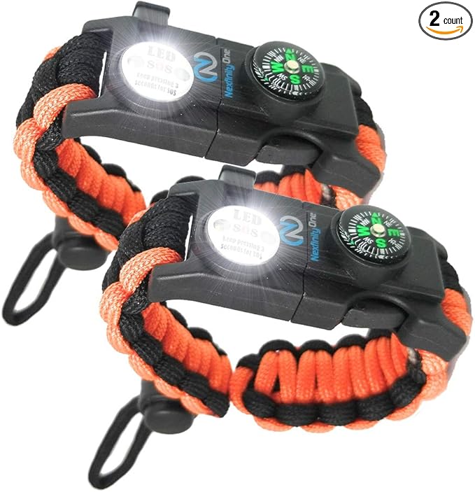 Survival Paracord Bracelet - Tactical Emergency Gear Kit with SOS LED Light, 550 Grade, Adjustable, Multitools, Fire Starter, Compass, and Whistle - Set of 2
