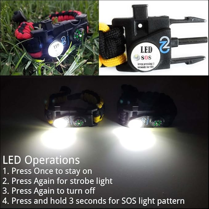 - SOS LED Light - This emergency survival bracelet has an LED light that can be used to help rescuers find you at night!