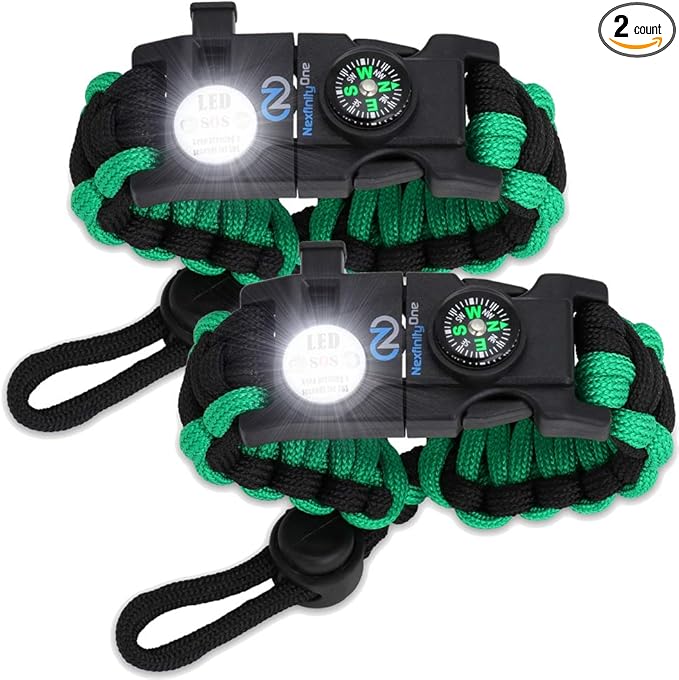 Survival Paracord Bracelet - Tactical Emergency Gear Kit with SOS LED Light, 550 Grade, Adjustable, Multitools, Fire Starter, Compass, and Whistle - Set of 2