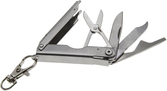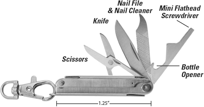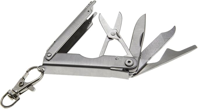 - 6 FUNCTIONS including: knife, nail file, nail cleaner, scissors, mini flathead screwdriver and bottle opener This multi-tool has sharp edges and should be handled with care