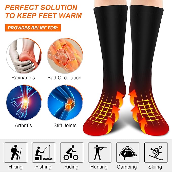 • 🔥Warm up Quickly: The electric heating element of this warm heated socks is recessed in front insteps to help focus heat in the toes to warm your whole feet. 1 rechargeable heated socks equal to several regular socks to keep you warm enough