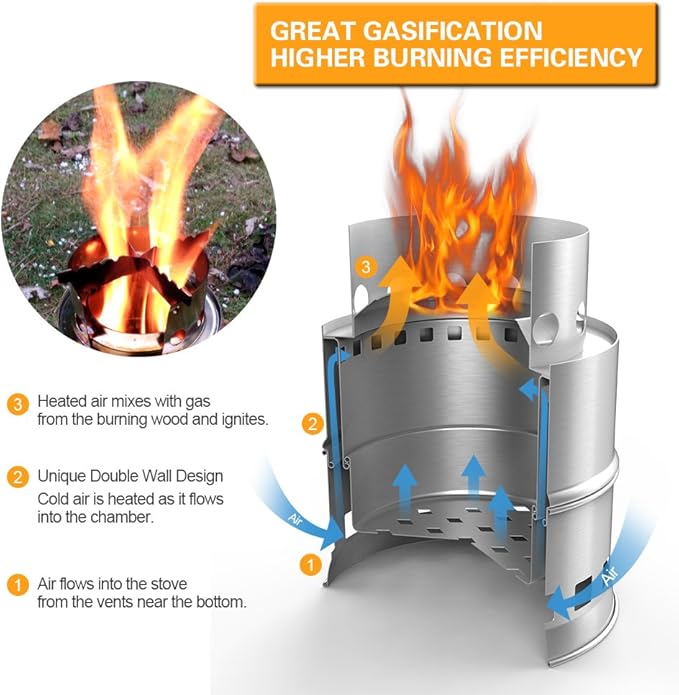 - EFFICIENT BURNING, LESS SMOKE: The wood stove is designed with a simple yet scientific structure: Wide opening makes it easy to add wood; Double-wall structure creates a clean gasification and secondary combustion; Air vents near the bottom improve air circulation to help the fuel burn more completely with less smoke.