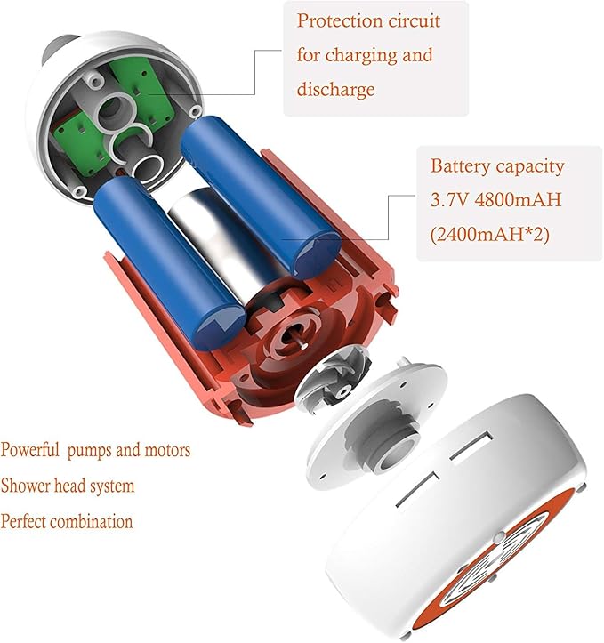 • Builtin High-energy Lithium Battery: The portable electric shower is builtin 4800mAh rechargeable battery,Compact, lightweight, and easy to carry in Car Trunk , Backpack or Luggage.or It is essential for family emergency.