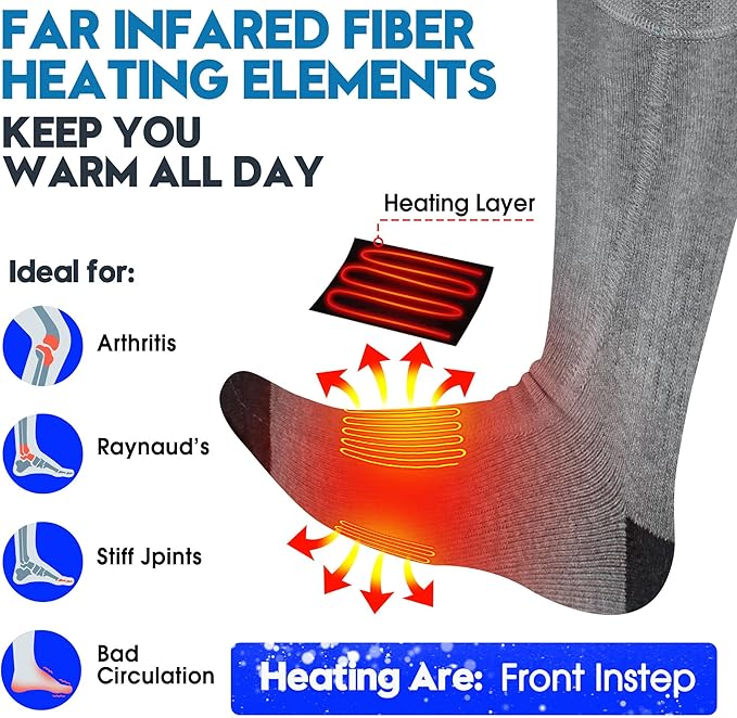 - 【Long Working Hours Autocastle Winter Motorcycling Foot Warmer】Powered by 3.7V/2200mAh li-ion Batteries,Autocastle Novelty Heated Socks Can Work Up to 6.5 Hours After Fully Charged in the Lowest Settings.Autocastle unisex Rechargeable Electric Heated Sox Can Keep Your Feet Warm For All Day Long.Autocastle Winter Warm Rechargeable Unisex Heated Socks Perfect for Raynaud's,Stiff Joints,Arthritis,etc.