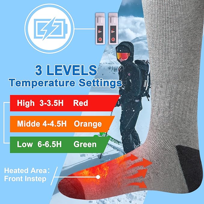 - 【Autocastle 3.7V Men Women Battery Heated Sox Kit】Designed with 3 Heating Systems,Autocastle 3.7V Winter Warm Rechargeable Battery Heated Stockings Can Meet Various Needs.Autocastle 3.7V Unisex Rechargeable Heated Socks with Highest Temperature Ups to 122°F.Highly Recommend to Turn on Autocastle Heated Socks at Highest Setting(Red Light) in the First 5-15 Minutes,Then Switch to Medium (Orange Light)or Lowest(Green Light)Settings,Thus Will Be Better.