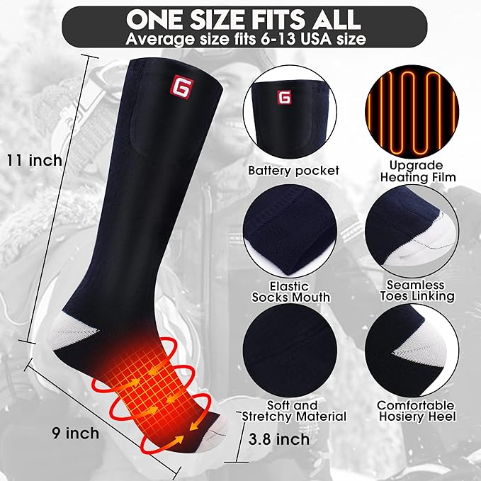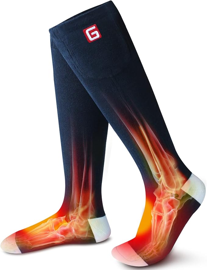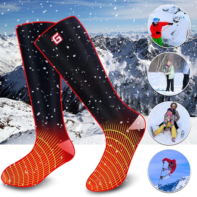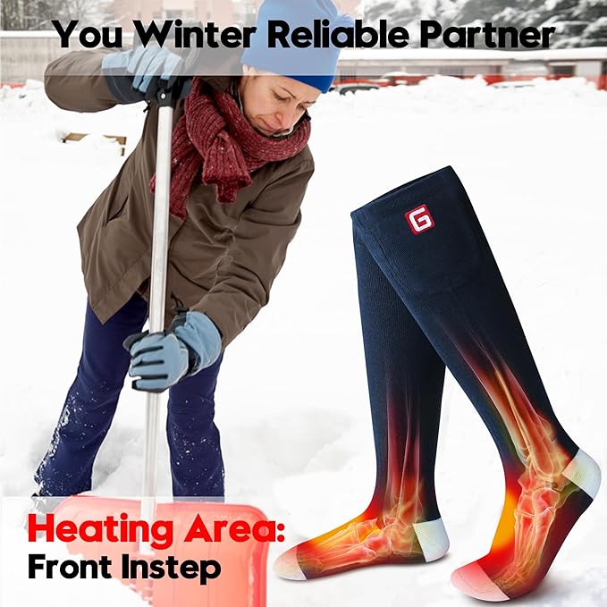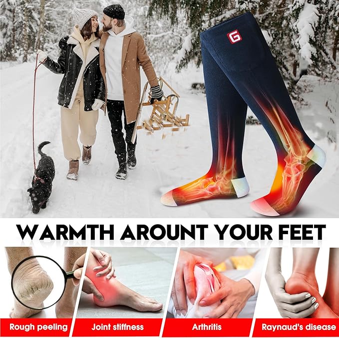 - ⛷ Improve Blood Circulation: Rechargeable battery operated electric heated socks with far infrared fiber heating elements, help those who have Arthritis, Raynaud’s, Stiff Joints or chronic circulation issues, improve blood circulation and reduce soreness. Electric insulated material offers you safe thick socks, keeps your feet warm and comfortable in cold winter.