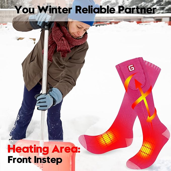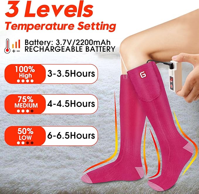 - 💕Instant Heat: Rechargeable electric thermal insulated heated socks are powered by a pair of 3.7V rechargeable Li-ion batteries (INCLUDE), heating temperature up to 125°F, heating element is on the top of the foot near the toes. Three adjustable heat settings for different temperature demands.