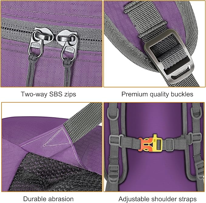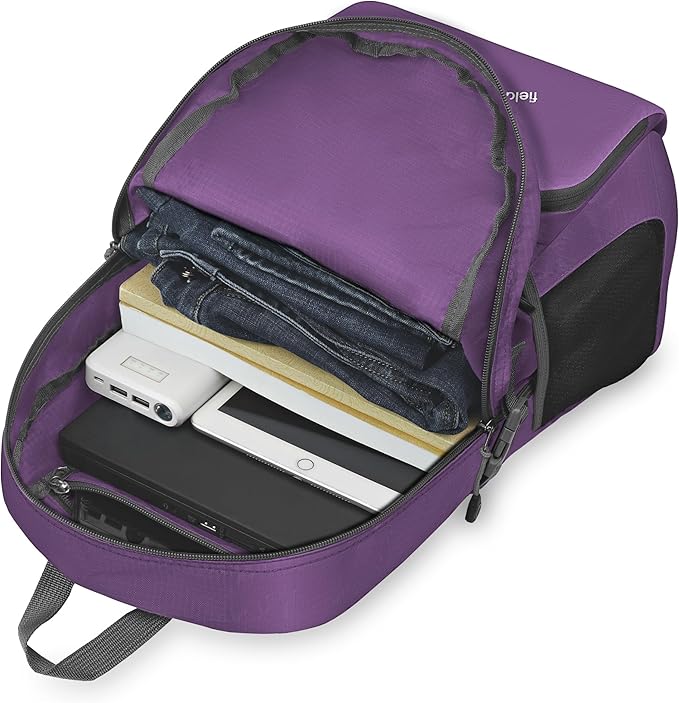 - 35Litre Large Capacity: Our 35l foldable backpack features 2 compartments and 1 inner separator in the main compartment keep your things assorted and organized; 1 inner zipper slip pocket for small wallet, passport, ID card and driver license,etc valuables; 2 front zipper pockets for quick access; 2 side water bottle pockets with bungee for water bottles,umbrella and sunglasses.