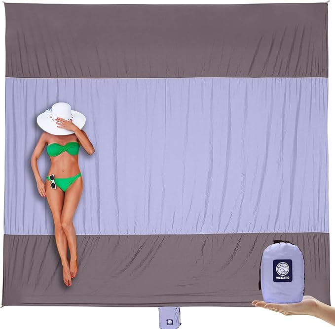 WEKAPO Beach Blanket Sandproof, Extra Large Beach Mat, Big & Compact Sand Free Mat Quick Drying, Lightweight & Durable with 6 Stakes & 4 Corner Pockets