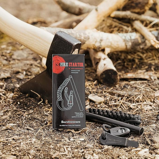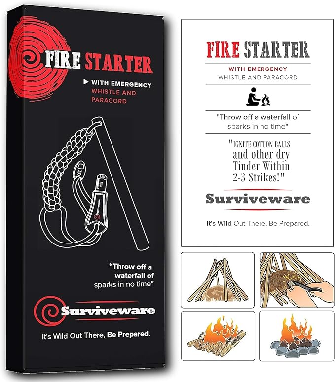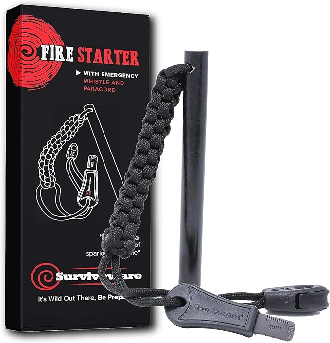 Surviveware Survival Fire Starter with Emergency Whistle, Paracord Handle, and Steel Serrated Scraper