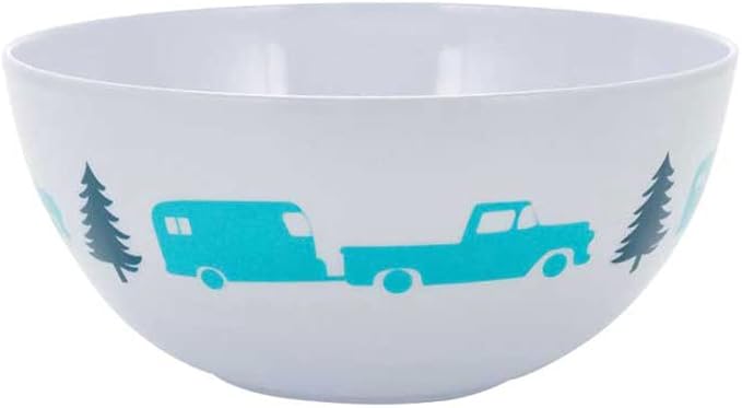 Camco Life is Better at The Campsite Bowl- White with Teal and Navy Retro RV, Trailer and Camper Print , Great for Cereal, Fruit and Desert BPA Free, Melamine(53225)
