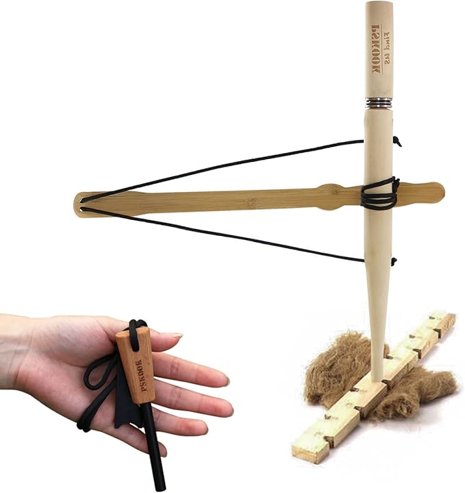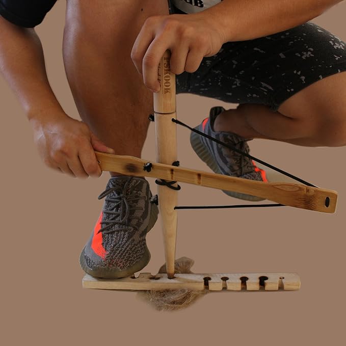 - 🔥 [EASY-TO-USE BOW DRILL FIRE STARTER KIT] Keep drilling the fire board vertically until producing smoke by friction with the wrapped sting of the bamboo handle, then you can make the fire. Whoever can quickly get started, easily experience and master the primitive fire method.