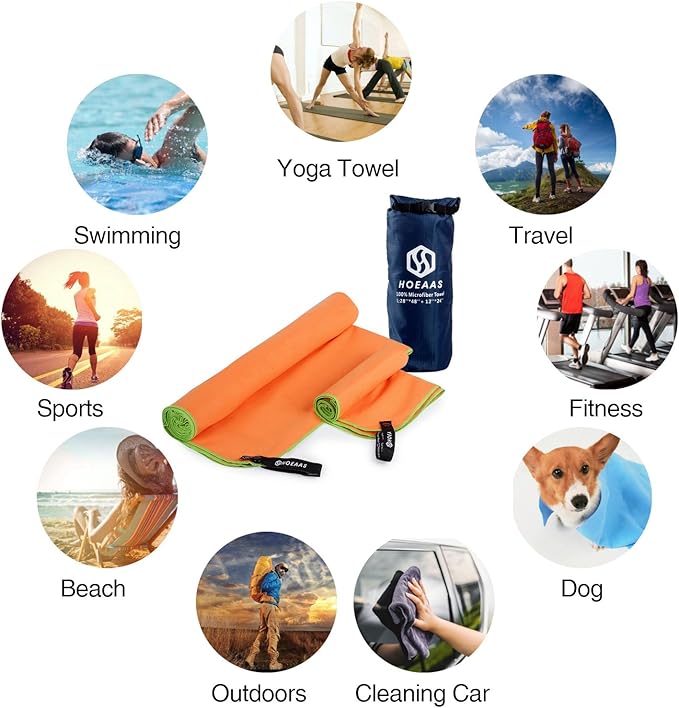 - SUPER ABSORBENT & QUICK DRYING: HOEAAS microfiber camping towel is made of soft and skin-friendly microfiber fabrics, which super absorbent and fast drying. Soaks up 5X its weight in water and dries nearly 10X faster than cotton towel, repeat use it a short time, no bad odors. So you never have to worry about your microfiber beach towels soiling or stinking up the rest of your gear. After dry your sweat or body water, Spread out or hang up the quick dry towel will be dry in minutes!