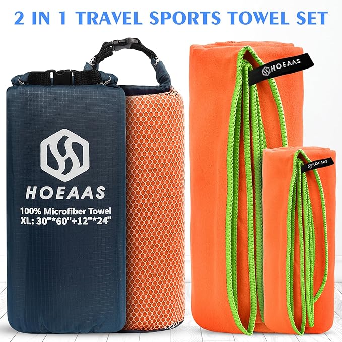 - SUPER ABSORBENT & QUICK DRYING: HOEAAS microfiber camping towel is made of soft and skin-friendly microfiber fabrics, which super absorbent and fast drying. Soaks up 5X its weight in water and dries nearly 10X faster than cotton towel, repeat use it a short time, no bad odors. So you never have to worry about your microfiber beach towels soiling or stinking up the rest of your gear. After dry your sweat or body water, Spread out or hang up the quick dry towel will be dry in minutes!