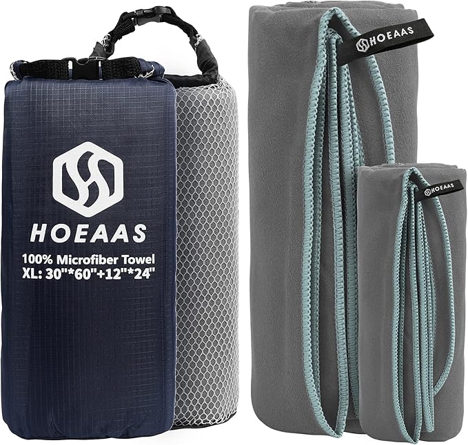 - SUPER ABSORBENT & QUICK DRYING: HOEAAS microfiber camping towel is made of soft and skin-friendly microfiber fabrics, which super absorbent and fast drying. Soaks up 5X its weight in water and dries nearly 10X faster than cotton towel, repeat use it a short time, no bad odors. So you never have to worry about your microfiber beach towels soiling or stinking up the rest of your gear. After dry your sweat or body water, Spread out or hang up the quick dry towel will be dry in minutes!