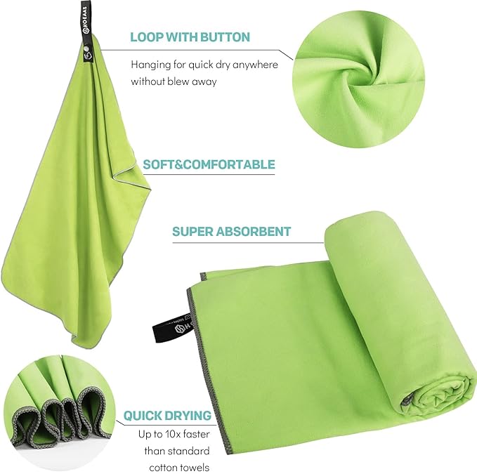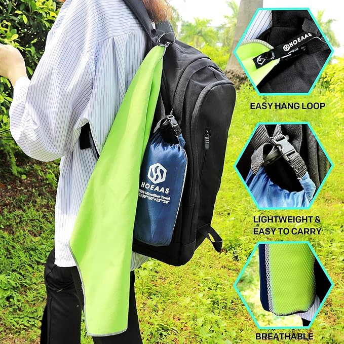 • SUPER ABSORBENT & QUICK DRYING: HOEAAS microfiber camping towel is made of soft and skin-friendly microfiber fabrics, which super absorbent and fast drying. Soaks up 5X its weight in water and dries nearly 10X faster than cotton towel, repeat use it a short time, no bad odors. So you never have to worry about your microfiber beach towels soiling or stinking up the rest of your gear. After dry your sweat or body water, Spread out or hang up the quick dry towel will be dry in minutes!