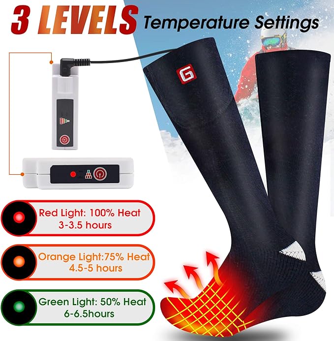 - 🔥Instant Heat &3 Levels Temperature Settings: Battery heated socks has 3 heating levels, High at 100% heat, Medium at 75% heat, Low at 50% heat, you can adjust the heat level for different needs. Warm up easily and heating up quickly in a minute and feet get warm and toasty