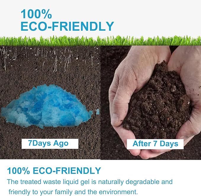 - WORKS WITH ALL HUMAN & PET LIQUID WASTE TREATMENT: why it’s called Poo Gel, since it absorbs liquid waste until there’s only a gel-like consistency left to dispose of. You can either pour the powder first & then the liquid waste is added. Or if you’re using a portable toilet & an compostable portable toilet bag, you can add the powder after the liquid waste. It even can be used in water. Next, it only takes 1-2 mins to solidify into a gel. Then, to properly dispose of it, you’ll have to let it disintegrate in the ground (takes about 7 days) or in direct sunlight (takes about 5 days).