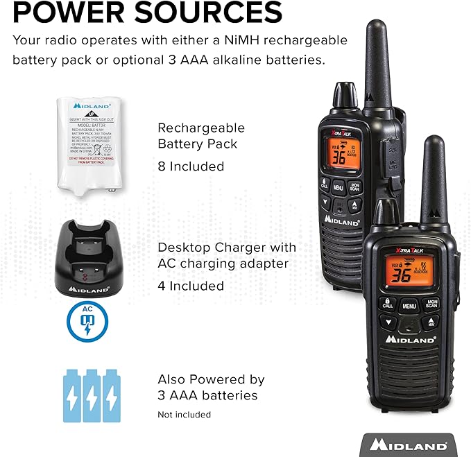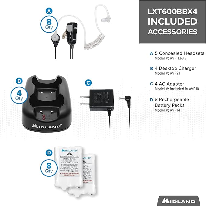 - INCLUDED IN THE BOX: Radios (x8), Belt clips (x8), Concealed Headsets (x8), Rechargeable battery packs (x8), Desktop charger (x4), AC Adapter (x4), and an owner’s manual