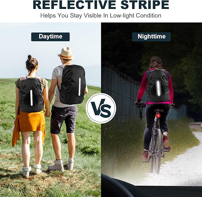 - [Rain cover for backpack]: Don't let a drop of water in. It can resist water of 2000mpa hydraulic pressure rate. Strap around middle of bag is excellent feature to secure in wind, 1 storage bag for easy carrying out