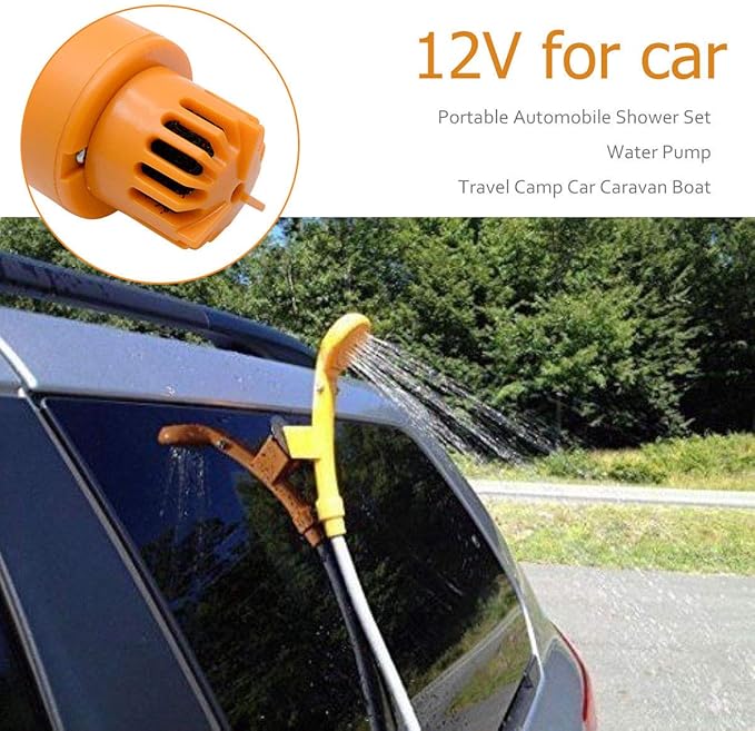 - Portable camping shower easy to use, connect 5 meter cable to the cigarette lighter of the car, install the Showerhead, put the hose pump into the water, turn on the switch, the water will become a steady stream of water for you to enjoy a comfortable bath.( Do not place the pump in the river or in the sea, which will cause malfunction.)