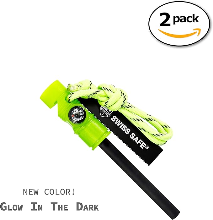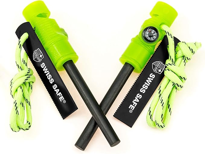 Swiss Safe 5-in-1 Fire Starter with Compass, Paracord and Whistle (2-Pack) for Emergency Survival Kits, Camping, Hiking, All-Weather Magnesium Ferro Rod
