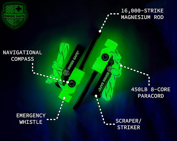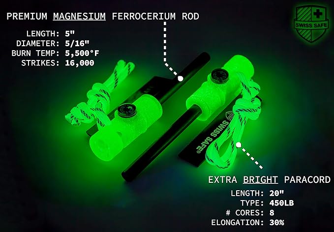 - All-in-One Survival Tool: Beyond its primary fire-starting feature, it incorporates a precision compass for navigation, a 150dB whistle for emergency signaling, a robust steel scraper, and a 450 LB 8-core paracord for any situation & rod.