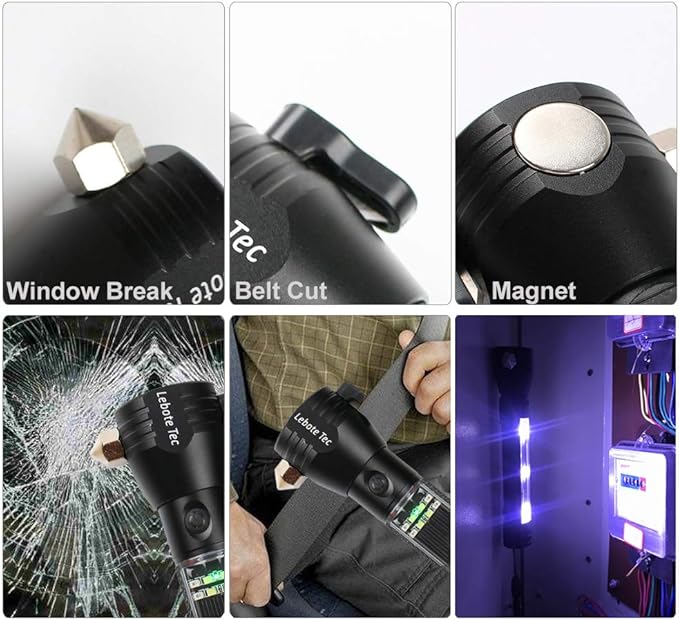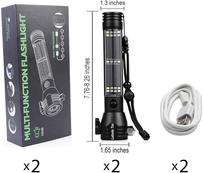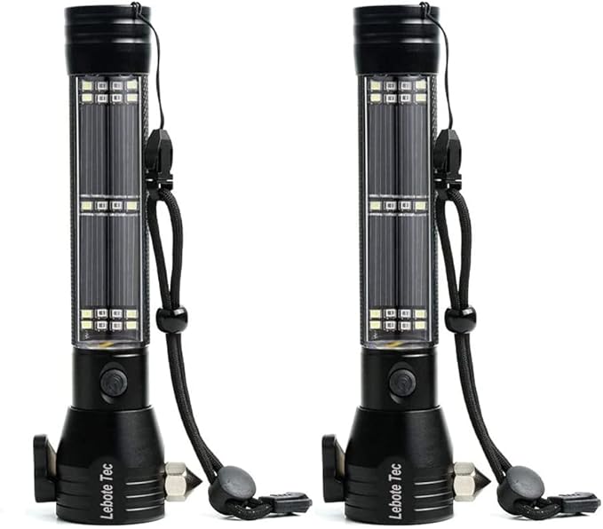 Lebote Car Flashlight Solar Power Tactical Flashlight Multi Function Flashlight Bright LED Emergency Torch Light With Safety Hammer Seat Belt Cutter Compass For Hiking Camping