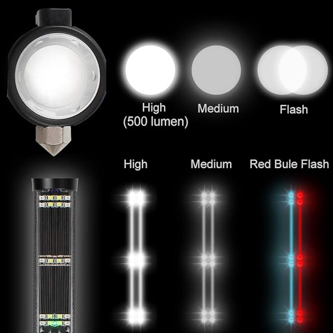 - 2.Alarm 120DB:There is a special alarm horn with 5 kinds of alarm sounds on light bottom and easily controlled by switch.This design brings safe in emergency and dangerous