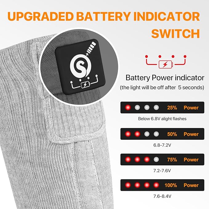 - 【Use 7.4V Instead of 3.7V & 5V Battery & with Touch-Button Temperature Control】: SNOW DEER battery heated socks used 7.4V 2200mAh lithium polymer rechargeable battery .the heating time will longer than 3.7V&5V heated socks and the temperature will be more stable. Also it is with 3 heat setting smart controller for you adjust the temperature easily.