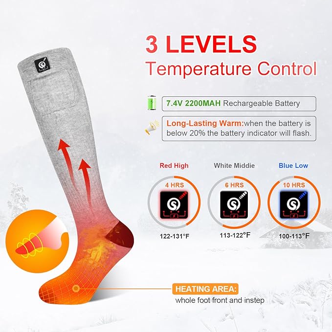 - 【7.4v 2200mah Batteries&3 Settings Temperature Controller】Battery socks powered by with 7.4V 2200mah rechargeable lithium battery packs,full charge around 3-4 hours,duration 3 - 8hours with 3 heat setting. controller LED red is for high temperature,white for medium temperature,blue for low temperature.you can easily adjust the temperature.