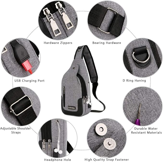 • PROFESSIONAL DESIGN - Our medium size sling backpack bag with usb charging port can be folded as a small size pack and expanded to a large bag. Lightweight(0.66lb) and portable, great for the gym and travel. Compared with other ordinary oversized sling bag, our chest bag adopts upgraded design: reinforced strap, flawless hardware zipper bag and perfect workmanship make it your great choice! Featured with front snap fastener to protect your stuff more safely and D ring hang buckle for hanging.