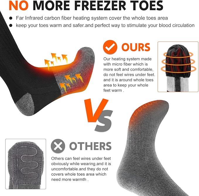 - 【Heating Elements Covers Whole Toes】this battery socks upgraded to use far infrared heating elements Which can be stimulate your blood circulation .for chronically cold feet from poor circulation, arthritis, Stiff Joints ,cold weather or simply just wanting more comfort and warmth.warm whole body.