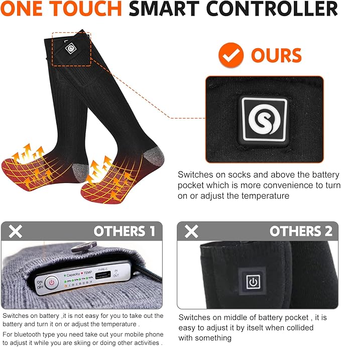 - 【 7.4V 2200MAH Rechargeable Li-ion Batteries】The heated socks includes a pair lithium-ion rechargeable batteries.the warm socks will last up to around 5-7 hours on the lowest setting , 3-4.5 hours on the medium setting and about 2 hours on the highest. If need to doing sports or work in outside very long time , suggest to buy extra batteries (sold separately).
