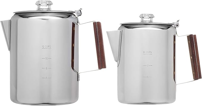 - NO ALUMINUM OR PLASTIC — Our camping coffee makers are toxin free, and make the best camp kitchen equipment. Don’t brew with lesser perculators that use aluminum and plastic. Choose a coffee percolator that will serve you well when you brew your camping coffee