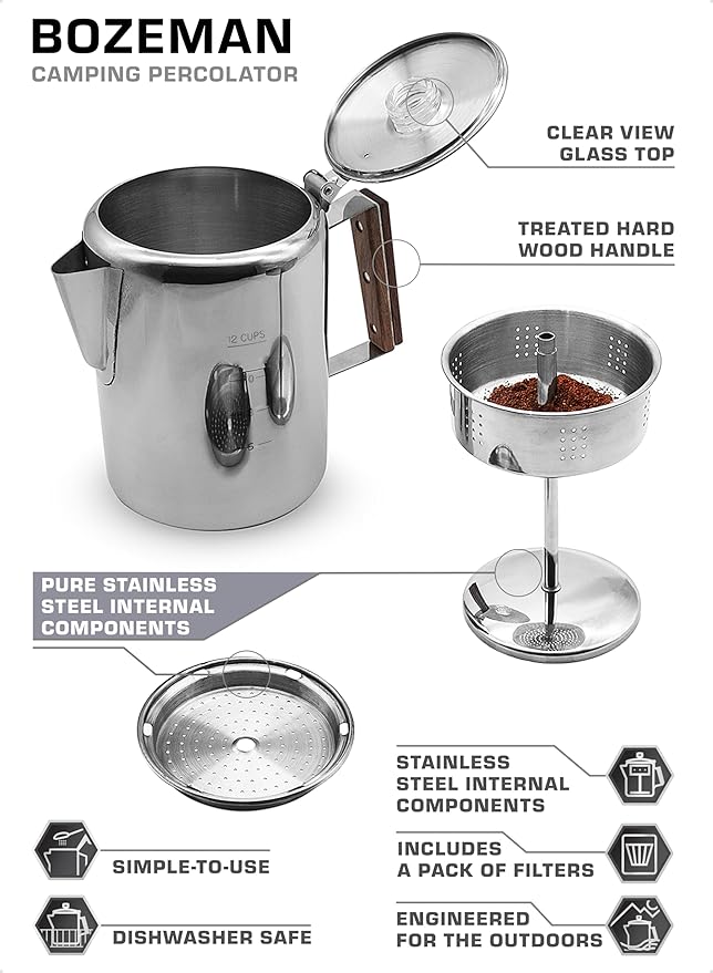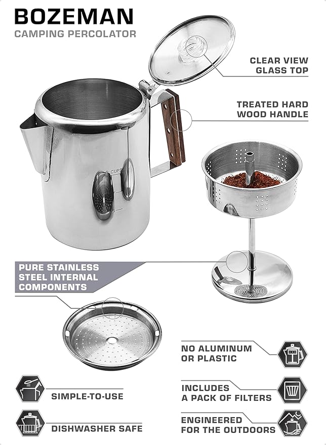 - EASIEST WAY TO MAKE CAMP COFFEE — A stainless steel camping coffee pot is simple, efficient, & classic. When you want something strong, and it’s too early for beer, brew with a Bozeman. The perfect stove top coffee maker
