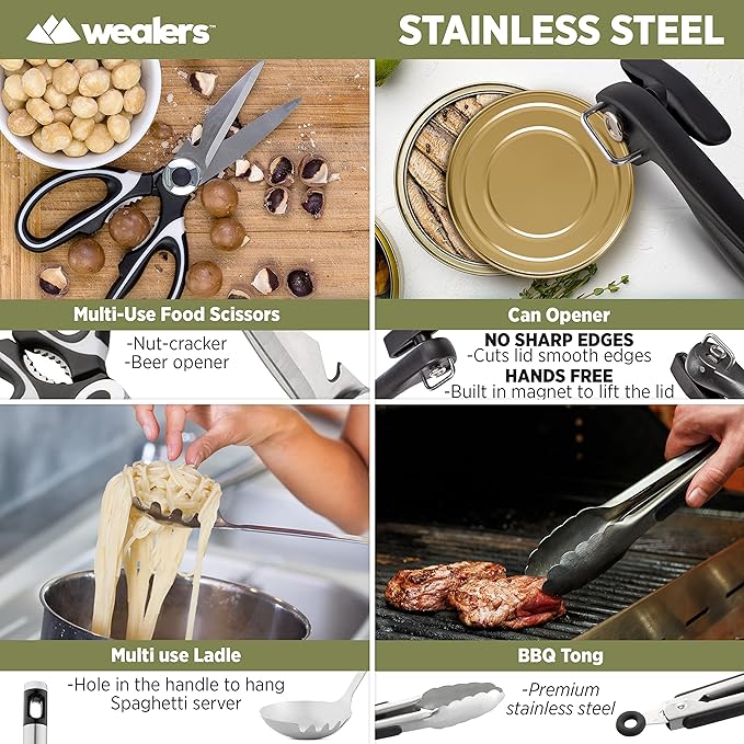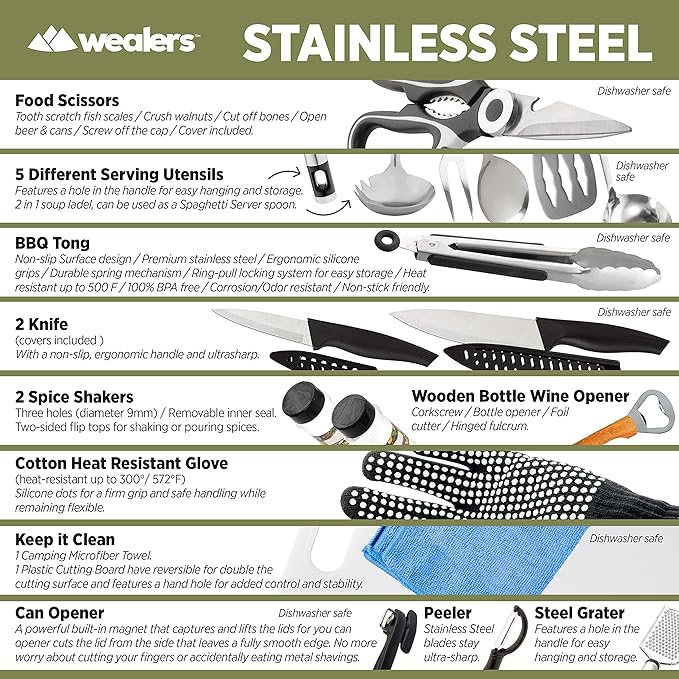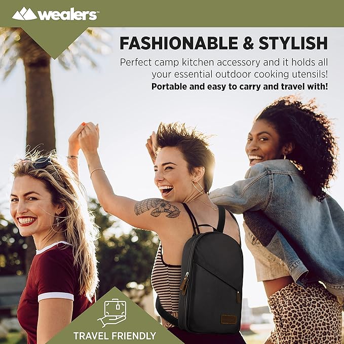 • MULTIPURPOSE: The trendy kit can be used for multiple applications, perfect for concerts, sporting events, hiking, boat rides, mountaineering and BBQ’s. The weather retardant the travel utensil kit is the perfect camp kitchen accessory, and it holds all your essential outdoor cooking utensils.