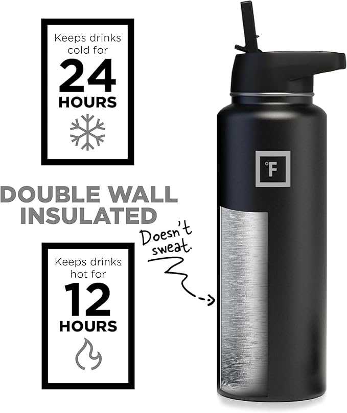 IRON °FLASK Camping & Hiking Hydration Flask, Wide Mouth, 3 Straw Lids, Stainless Steel Outdoor Water Bottle, Double Walled, Insulated Thermos, Metal Canteen - Midnight Black, 40 Oz