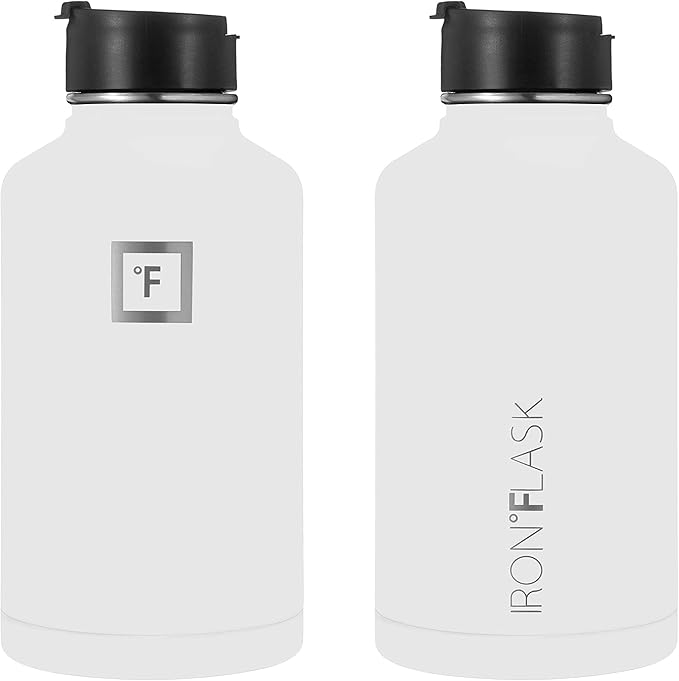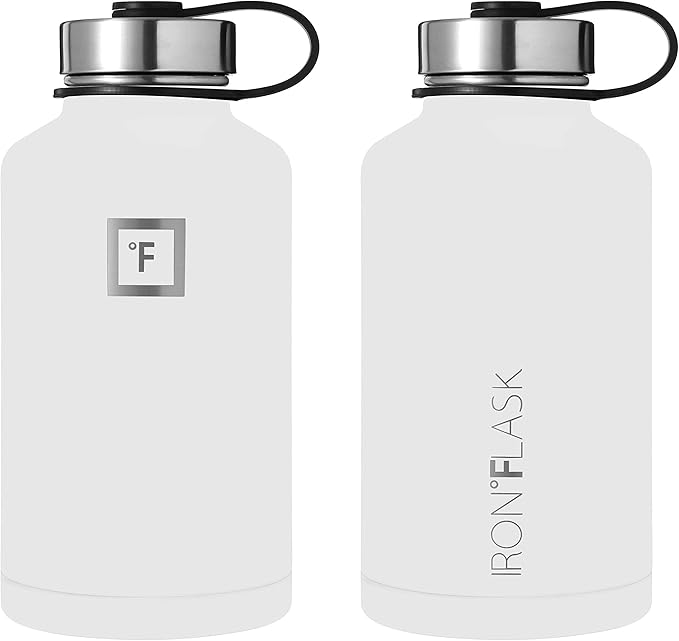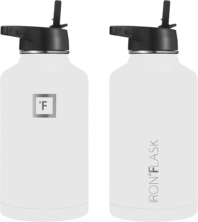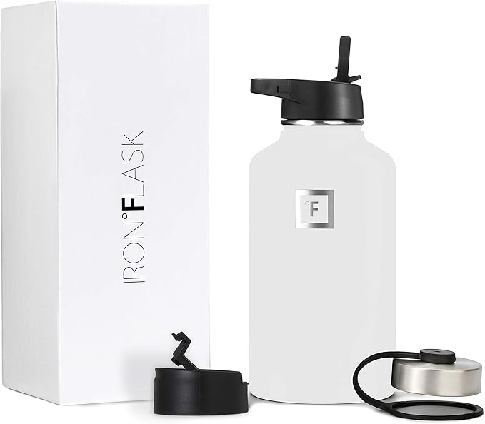 IRON °FLASK Camping & Hiking Hydration Flask, Wide Mouth, 3 Straw Lids, Stainless Steel Outdoor Water Bottle, Double Walled, Insulated Thermos, Metal Canteen - Winter White, 64 Oz