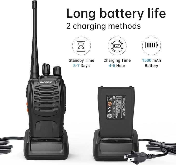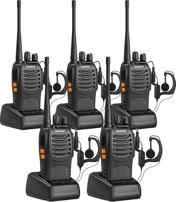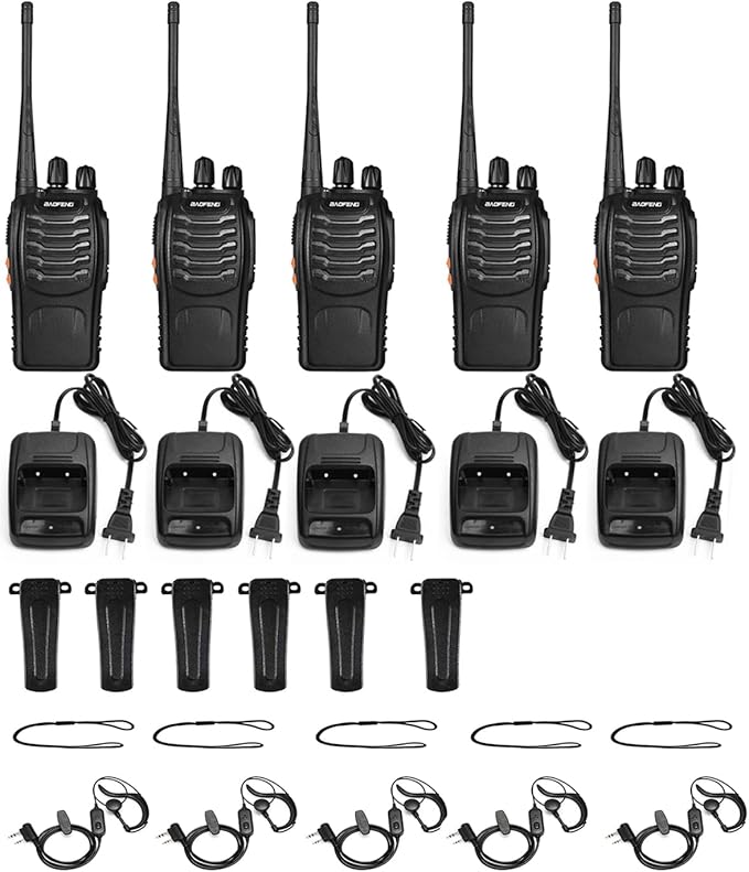 - Included Components : [Walkie Talkies x5, Earpieces x5, Batteries, Charger]