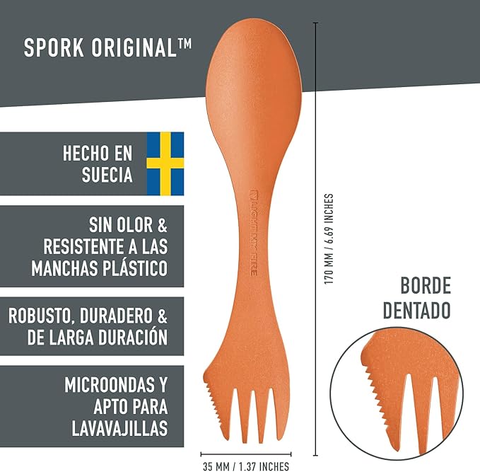 - SAY GOOD-BYE TO DISPOSABLES our camping utensil set spork is the only “on-the-go cutlery” you will ever need for eating on outdoor wilderness adventures. Starve the landfills with our responsibly made utensils. 2 sporks included. Rustyorange/Slatyblack