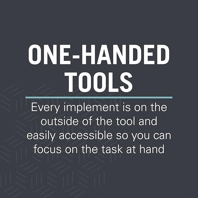 - ONE HAND ACCESS: Every implement is on the outside of the tool; Quickly open and close every tool with a single hand; Newly designed cam locks secure open tools in place