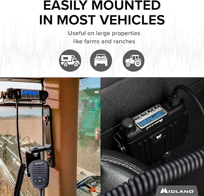 - FARM TRACTOR BUNDLE: Expand your communication range on the farm with 15-Watts of GMRS power in your vehicle or base station with Midland’s MXT115AGVP3 MicroMobile Farm Tractor Bundle. The bundle includes Midland’s MXT115 MicroMobile, MXTA13 6 Inch 2.1 dB antenna, antenna cable, and mounting bracket. The MXT115AGVP3 mounts in most vehicles and communicates with all Midland FRS/GMRS radios, has all 8 repeater GMRS channels