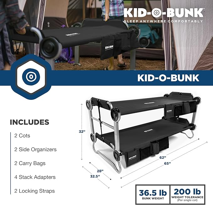 • INCLUDES: The set includes 2 cots, 2 side organizers for easy gear access, 2 carry bags for hassle-free transport, a set of stack adapters (2 in each bag) for flexible configuration, and 2 locking straps (1 in each bag) for added security.
