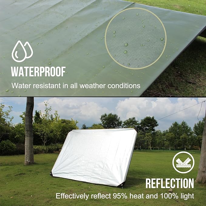 • ⛺️【Reusable and Durable】Rugged 4 Layers including PE, Polyester Mesh and Aluminum Foil. Suitable for Many Situations, including Raincoat, Camping, Hiking, Mountainning, Snowfield and Heavy Duty. Also Can be Used as Car Protection, Sunshine Shelter, Pets Shelter, SOS Signal, Solar Heater for Many Times.