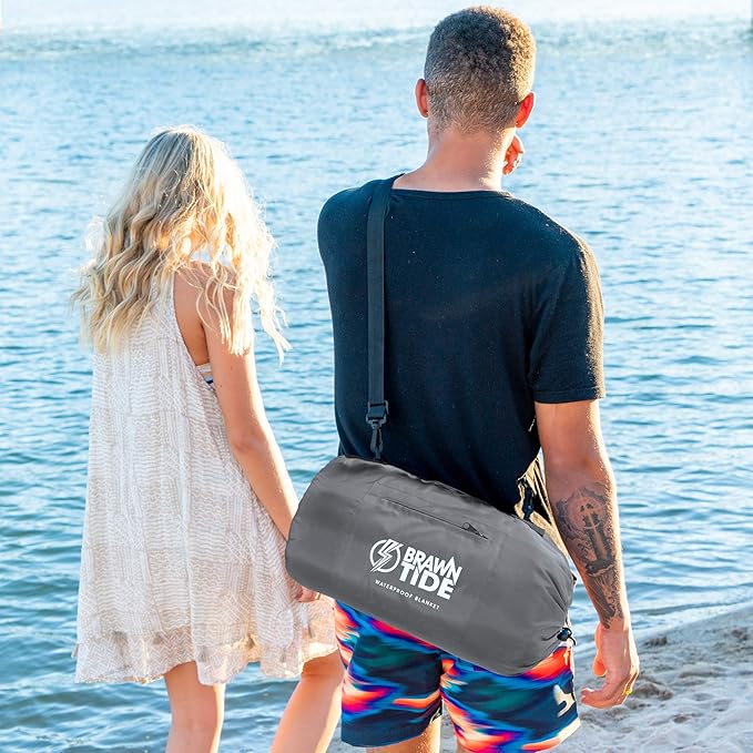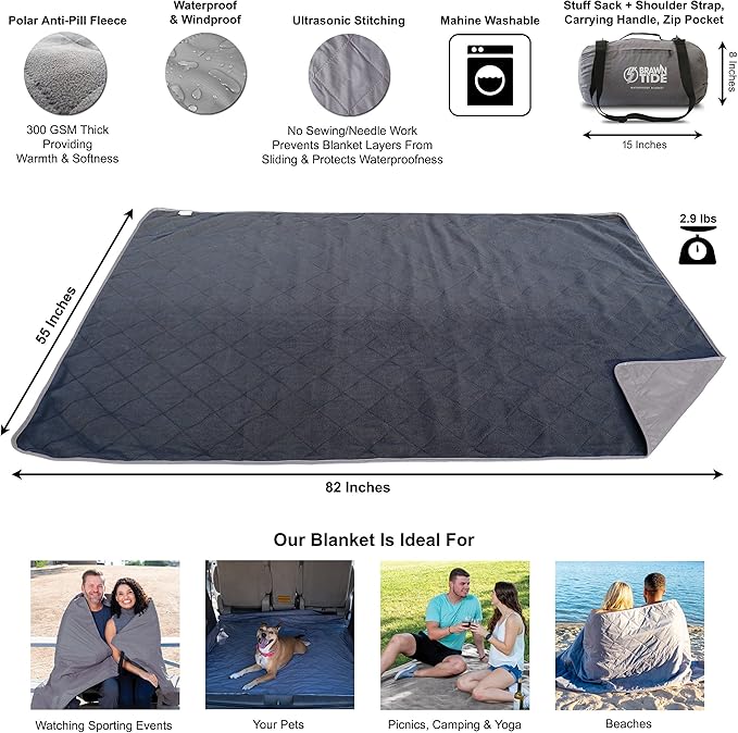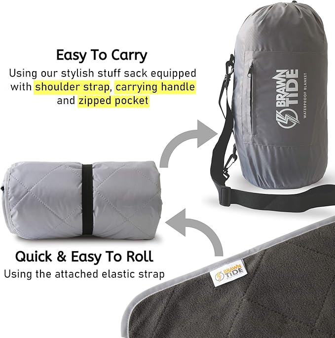 BRAWNTIDE Large Outdoor Waterproof Blanket - Quilted, Extra Thick Fleece, Warm, Windproof, Sandproof, Includes Stuff Sack, Shoulder Strap, Ideal for Beaches, Picnics, Camping, Stadiums, Dogs, Car