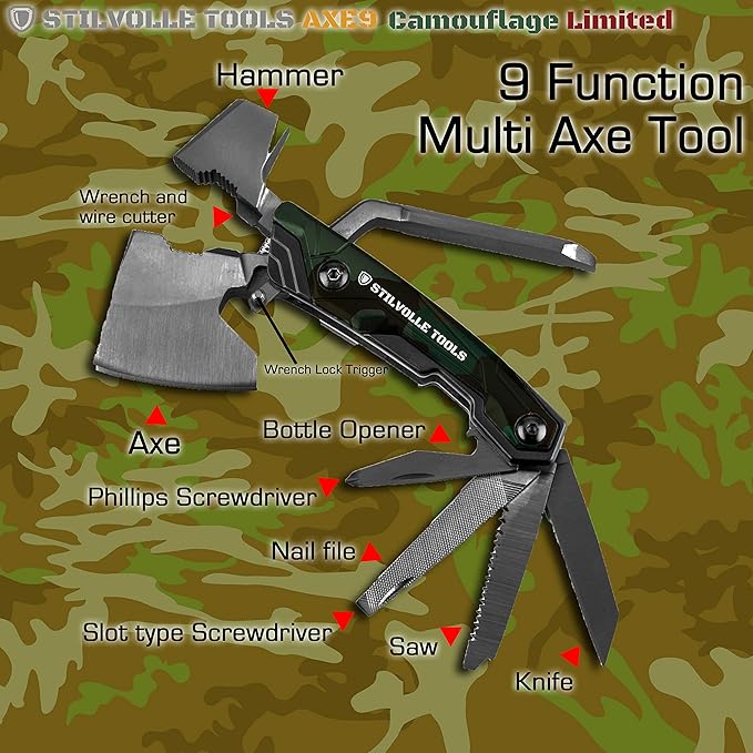 Axe 9 ax with 9-Featured Multi-Tool Hammer, Wrench, Wire Cutter, ax, Bottle Opener, Phillips Screwdriver, Flat-Blade Screwdriver, Nail File, Saw, Knife