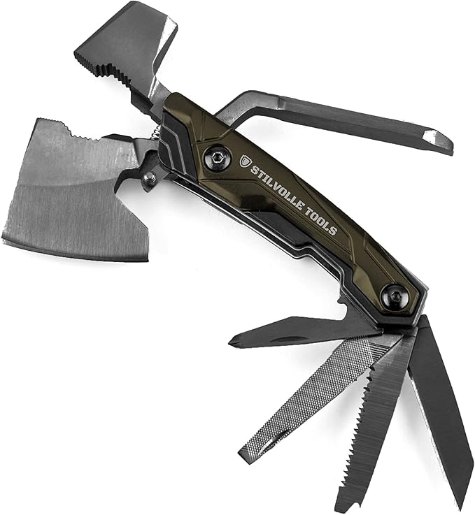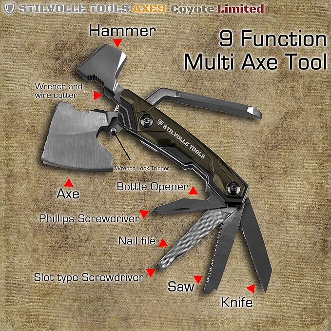 Axe 9 ax with 9-Featured Multi-Tool Hammer, Wrench, Wire Cutter, ax, Bottle Opener, Phillips Screwdriver, Flat-Blade Screwdriver, Nail File, Saw, Knife