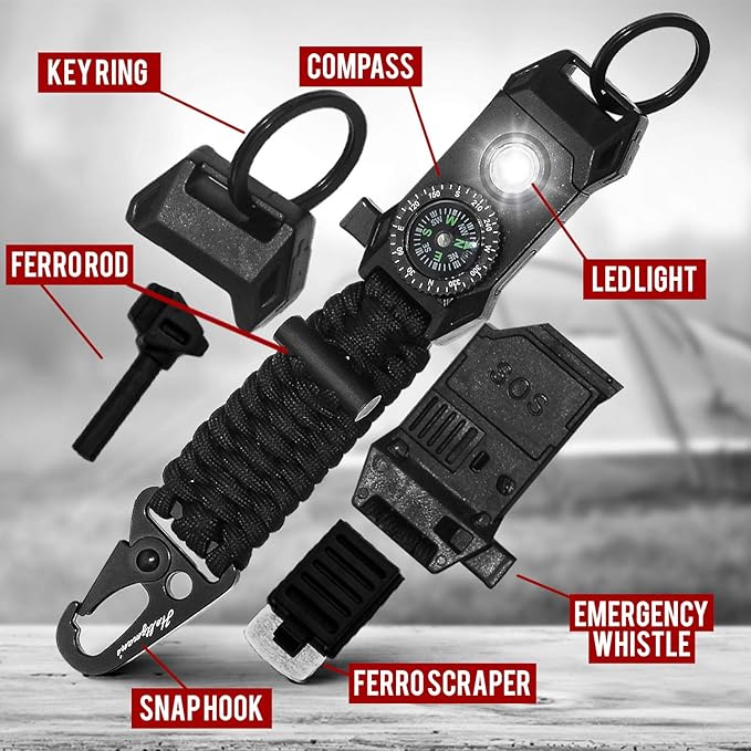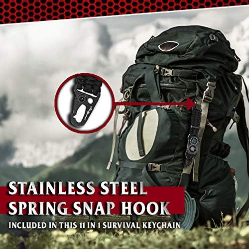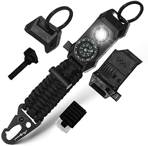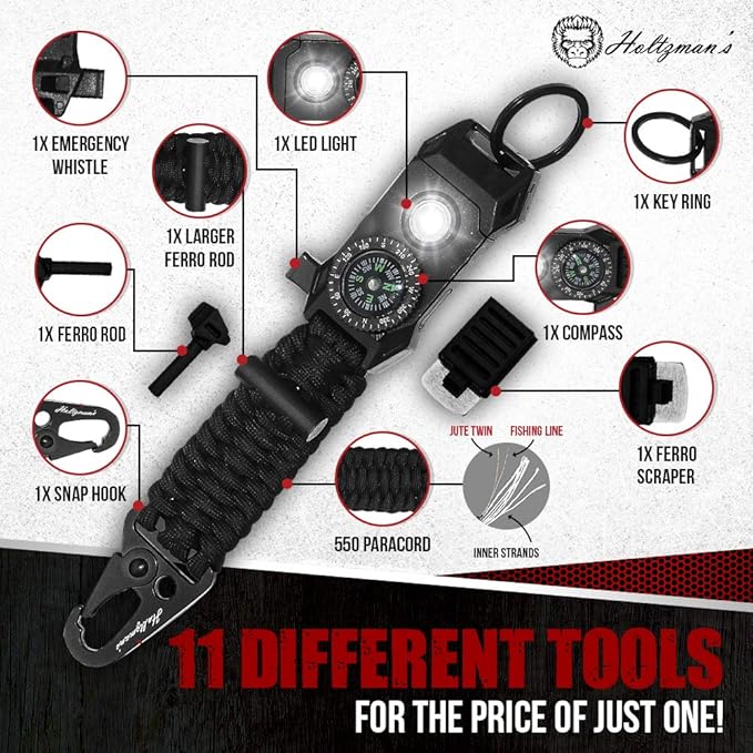 - ✅11 DIFFERENT SURVIVAL TOOLS FOR THE PRICE OF JUST ONE! Our heavy-duty paracord keychain features 9 essential outdoor survival tools, including 1 x Emergency Whistle, 2 x Flint Rod, 1 x Flint Scraper 1 x Key Ring, 1 x LED light, 1 x Compass, and 550 Paracord with Fishing line, and Jute Tinder, that will help make camping, mountain climbing or hunting a breeze!